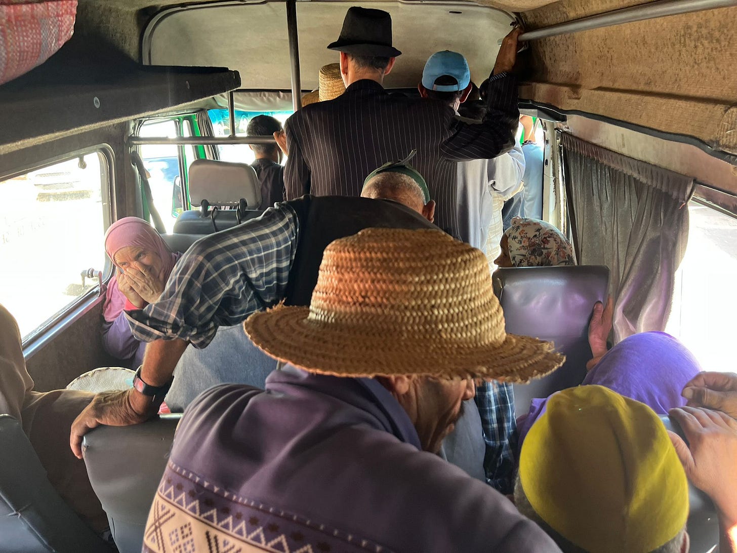 So we hopped on a van3 to Moulay Brahim, which was standing room only by the time we arrived. The driver tied our backpacks to the roof of the van with rope. The van stopped multiple times so older women with ginormous bags on their backs could sell water bottles and pass bundles of some kind of grain through the windows.